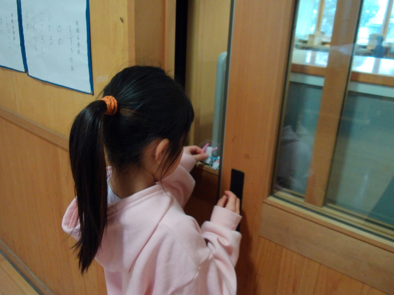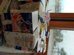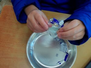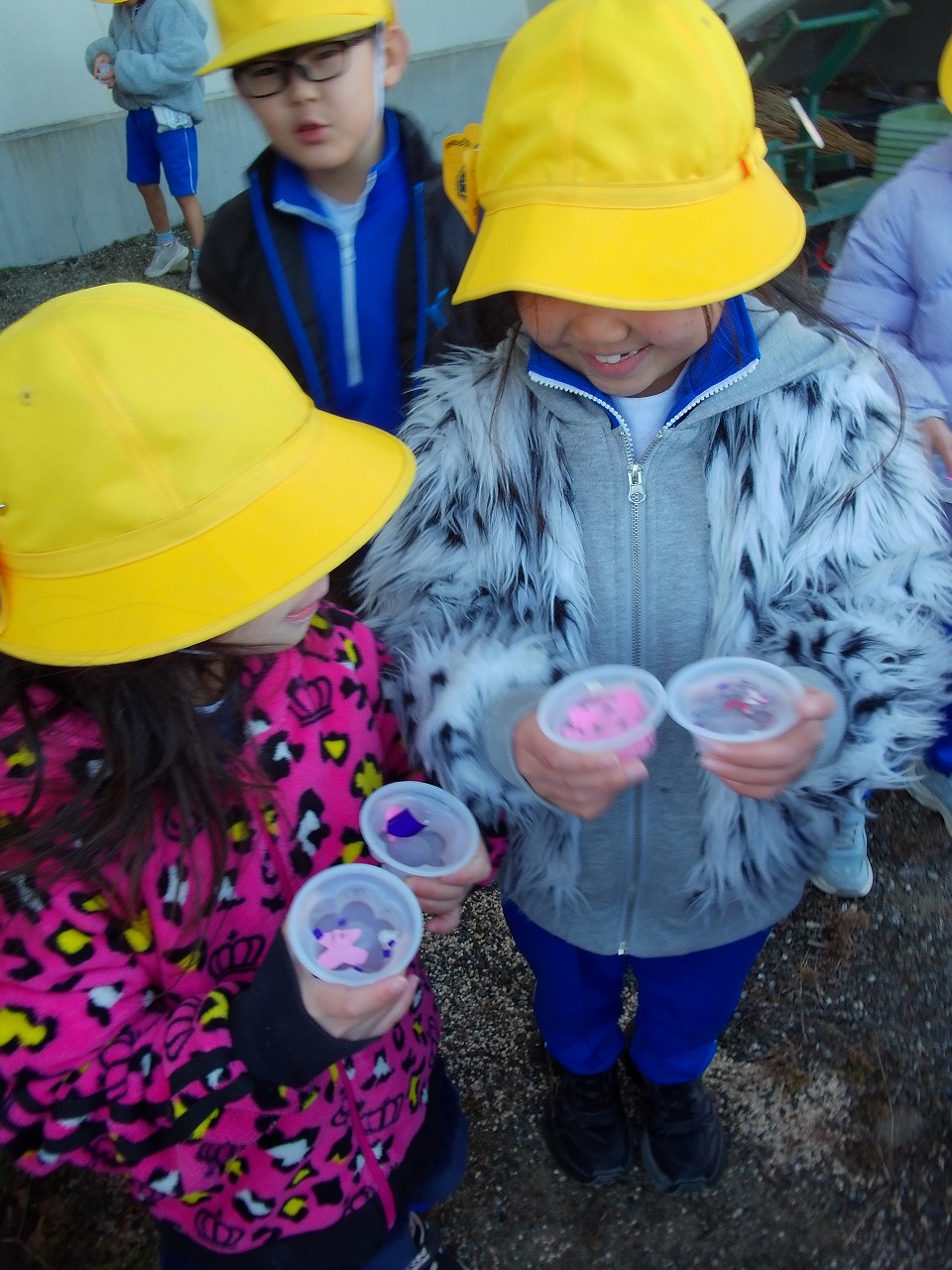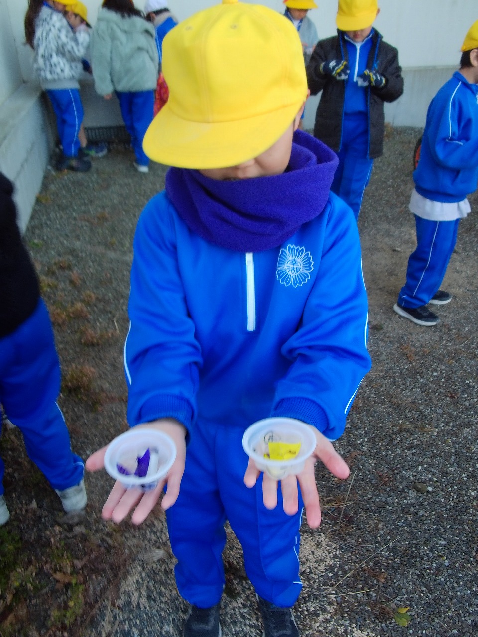 明日も寒そう・・・,ということで,みんなで氷づくりを行いました。カップの中に,様々な形に切った折り紙と水を入れ,氷づくりの準備をしました。みんなで,一番寒そうなところはどこかと話し合い,学校の裏に置くことにしました。