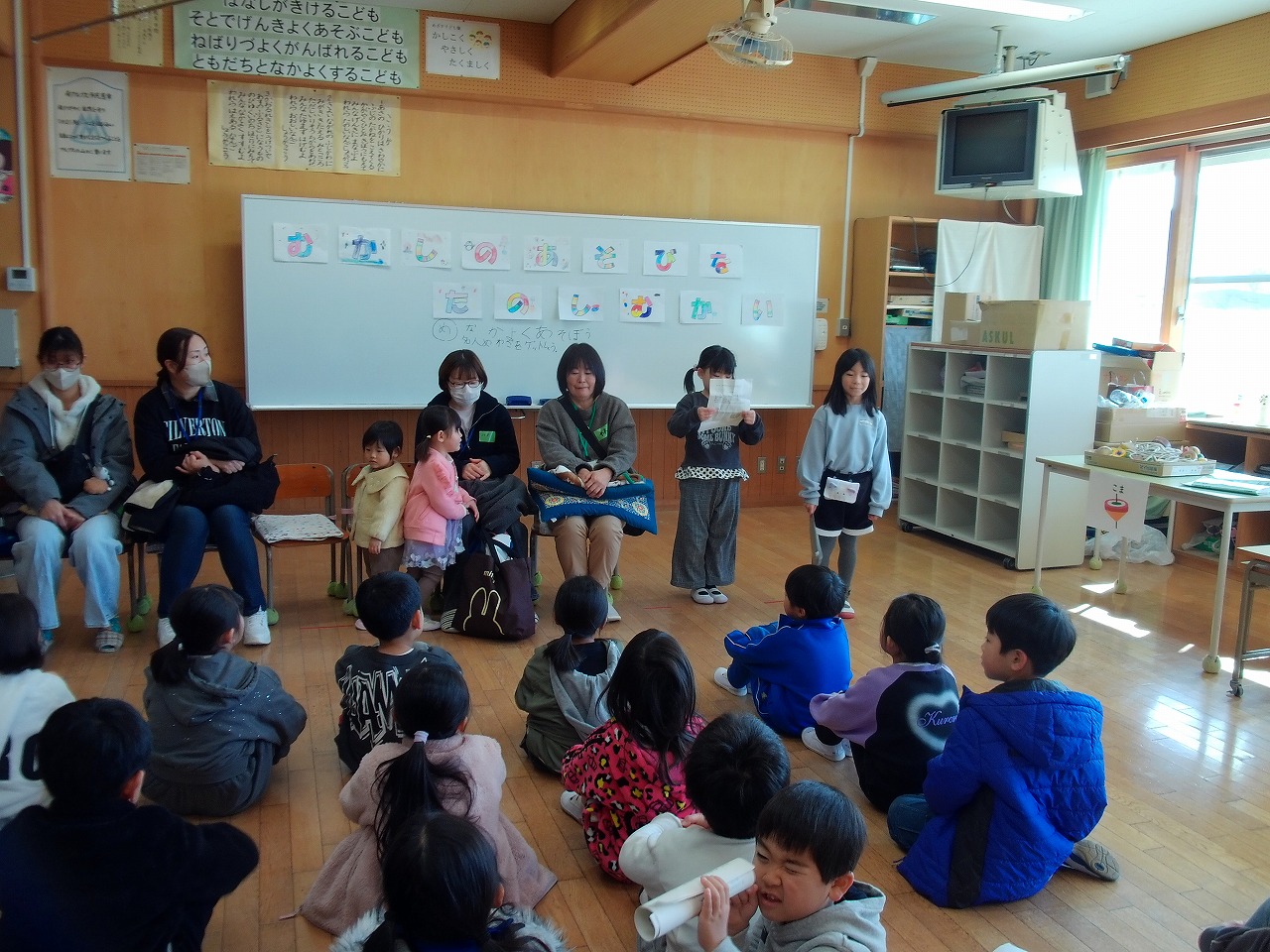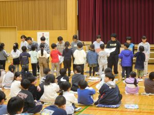 本日の3・4校時に,南湖保育所の年長児24名を招いて,1年生との交流会を行いました。全ての進行を子どもたちが行い,昨年担任していた保育所の先生方が感動していました。1年生による南湖小学校の紹介やグループごとの自己紹介,カードめくりゲームやしっぽおになどをして楽しみました。4月からは両者とも新1年生・2年生に進級します。これからもずっと仲良くしてほしいと思います。