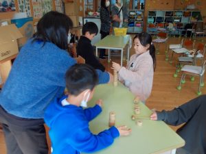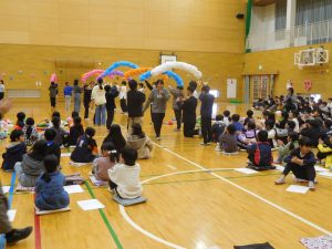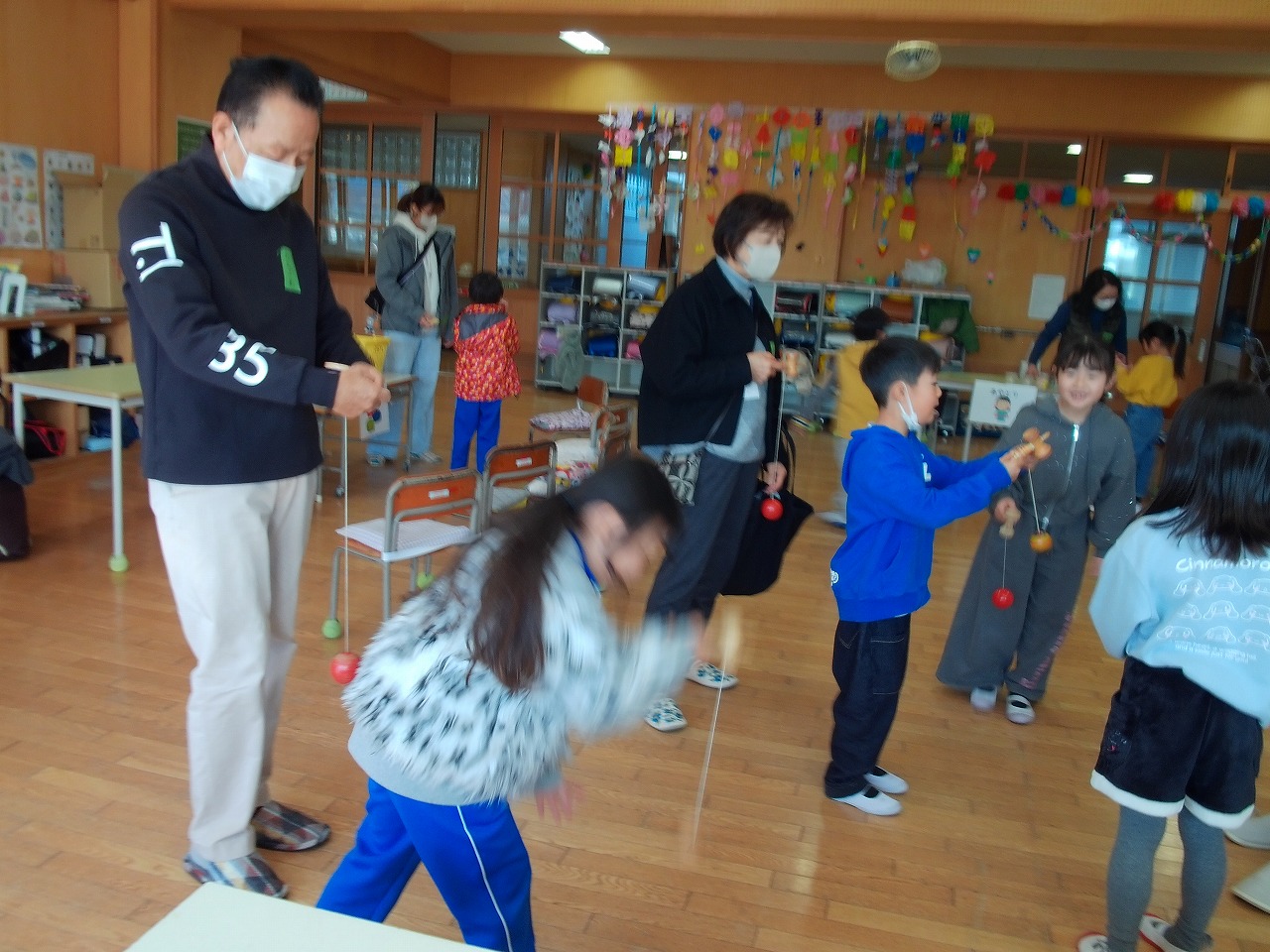 たくさんのおうちの人に来ていただき,「昔の遊びを楽しむ会」を行いました。おうちの人に教えてもらい,まりつき,だるま落とし,けん玉,ビー玉,あやとり,はねつき,コマ,お手玉の8つの遊びに挑戦しました。大人も子どもも夢中になって,楽しい時間を過ごすことができました。
