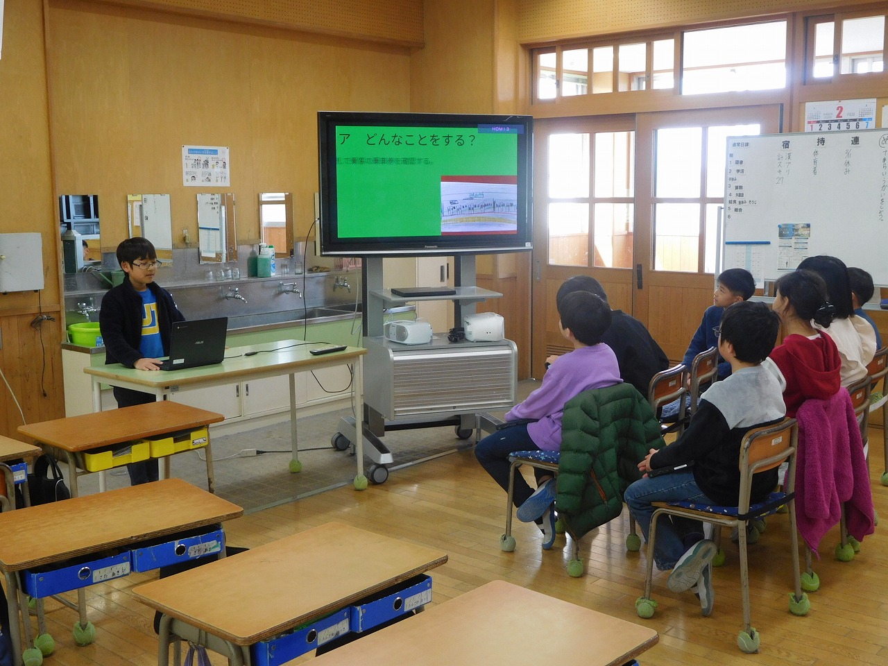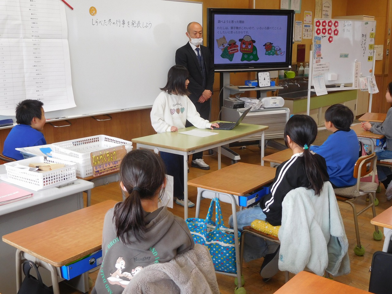 今日は,3・4年生の授業参観が行われました。3年生は,「冬の行事」の調べたことの発表を行いました。4年生は,「自分が将来なりたい職業」を調べ発表しました。どの児童もタブレットに調べたことをわかりやすくまとめ,発表もとても上手にできました。子どもたちは,一人一台端末を文房具のように使いこなしていて,感心しました。子どもたちが意欲的に学ぶことができた授業参観でした。