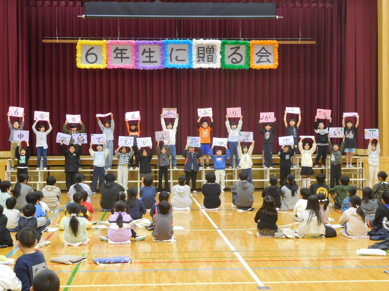 今日は,6年生に贈る会を全校で行いました。本校は,「送る」ではなく「贈る」会です。6年生へのプレゼントの意味を込めて,毎年行っています。各学年,今まで一生懸命,歌や呼びかけ,ダンスなどを練習し,今回発表しました。終わりの会で「発表を頑張った人」と聞くと,多くの子どもたちが挙手してくれました。みんな精いっぱい頑張ったと思います。いよいよ6年生は,卒業式まで14日です。残り少ない小学校生活を楽しんでほしいと思います。