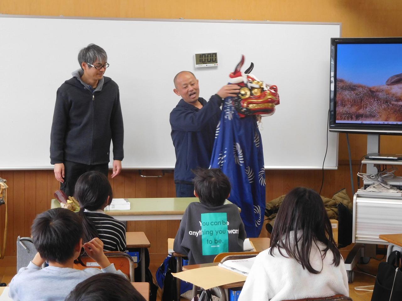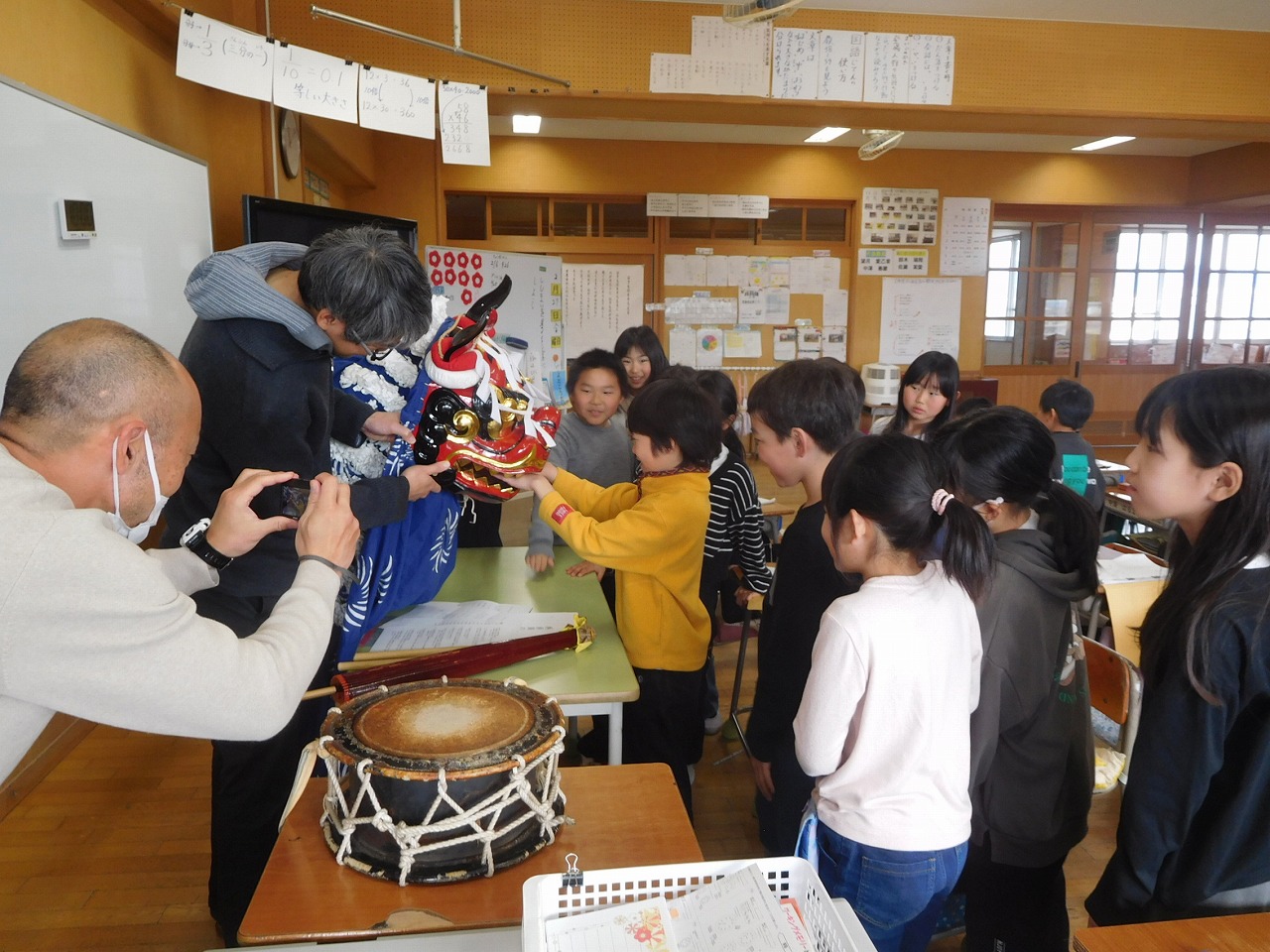 3年生は,総合的な学習の時間に,地域の伝統行事について学習しています。今日は,西南湖獅子舞保存会の2名の方を講師に迎え,学習を行いました。最初に子どもたちが事前に学習して疑問に思っていることの質問に答えていただきました。その後は,実際に獅子舞に触らせてもらったり,太鼓をたたかせてもらったりしました。机上の学習も大切ですが,実際に生で体験できることはもっと大切です。子どもたちが積極的に取り組んだ学習の機会となりました。