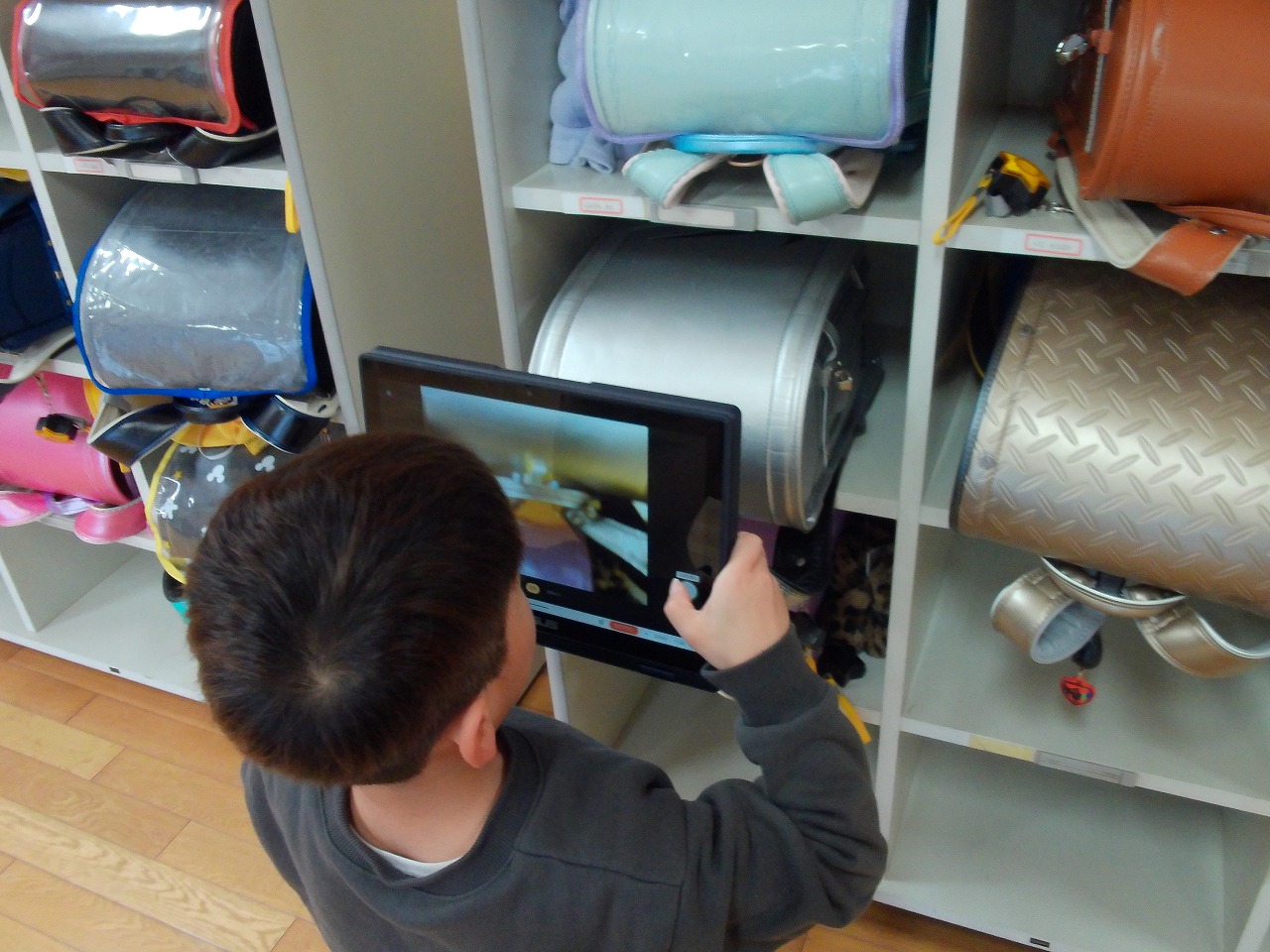 スポンジとモールで、小さな「すきまちゃん」を作りました。教室の中からすきまを見つけ、すきまちゃんを置き、タブレットのカメラで撮影しました。「こんなところにもいいすきまがあったよ!」「友達のと組み合わせると面白いよ!」と、楽しみながら活動を進めることができました。